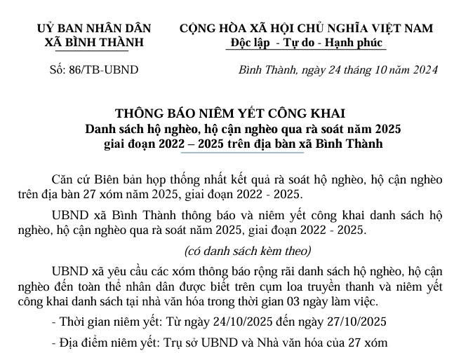 THÔNG BÁO CÔNG KHAI DANH SÁCH HỘ NGHÈO, CẬN NGHÈO NĂM 2025